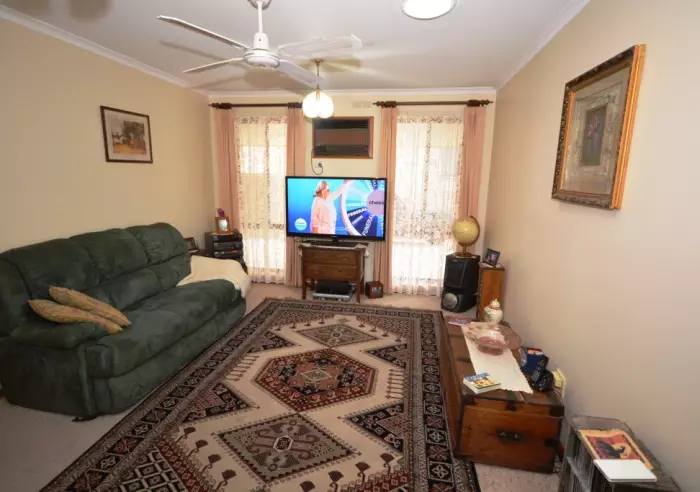 Compact but not cramped, the layout includes an air conditioned and gas heated lounge room, a generous kitchen with plenty of cupboards and bench space, electric oven and hot plates plus good space for the dining table and chairs. Two double bedrooms both with built in robes and the bathroom has a separate shower recess and full size bath.