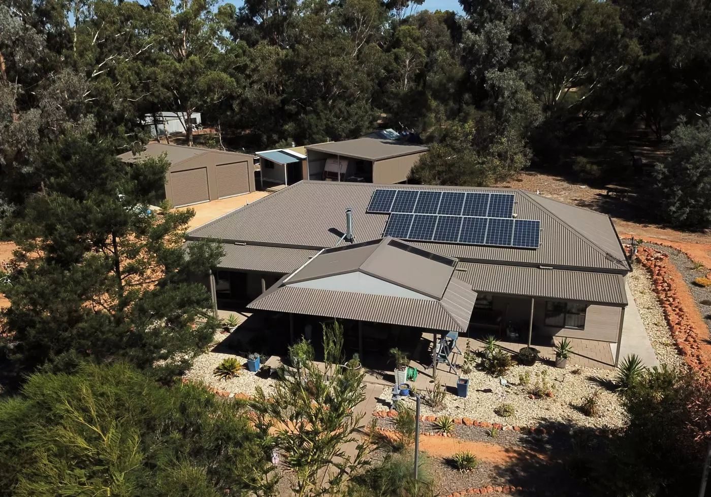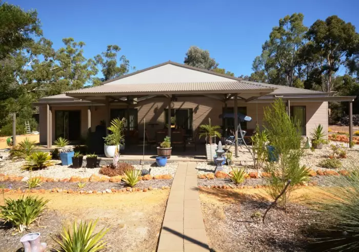 Connected to town water, mains power and the NBN there is also rainwater storage and twelve solar panels generating 3.2 kw of power. Additional features are the minimal maintenance requirements, eight metre by eight metre colourbond double garage on slab with power and two roll-a-doors, double carport, on site caravan and a one bedroom guest cabin with toilet, shower, lounge, kitchen and combustion heater.