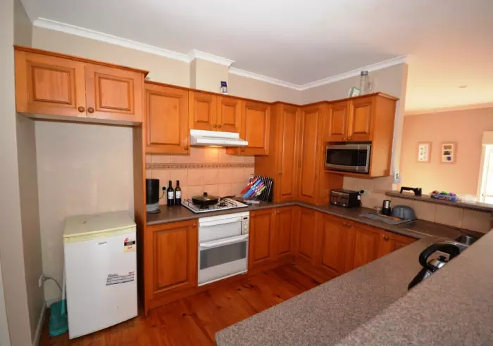 Comprising three bedrooms all with built in robes & OHF’s, aluminium framed windows, full house evaporative cooling, generous sized living room that opens up to the kitchen with gas cooking, a pantry, breakfast bar & ample storage. The dining room has polished floor boards and steps down onto the rear patio decking.