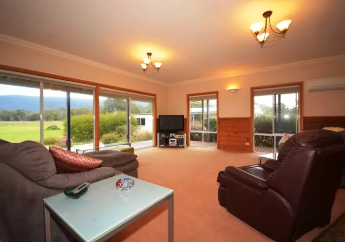 The Harkaway Pavilion design is ideally suited to the setting and the floorplan combines comfort, space and practicality to suit most families. The hub of the home is the very generous family room with jaw dropping views, reverse cycle air conditioning, combustion heating and a seamless connection with the kitchen and dining area boasting electric cooking, cavernous cupboard space, dishwasher and an island bench. Enjoy the fresh country air blended with bar b que aromas from the eight by five metre rear timber deck adjoining the kitchen and family room.