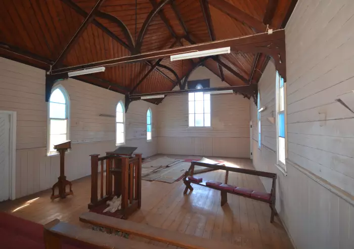 The nave or main body of the building is eleven metres long and six metres wide. In addition there is a small entry porch as well as a little vestry. The naturally well-lit interior has seven Gothic style pointed arch windows and features an elegant soaring ceiling and polished pine floorboards.