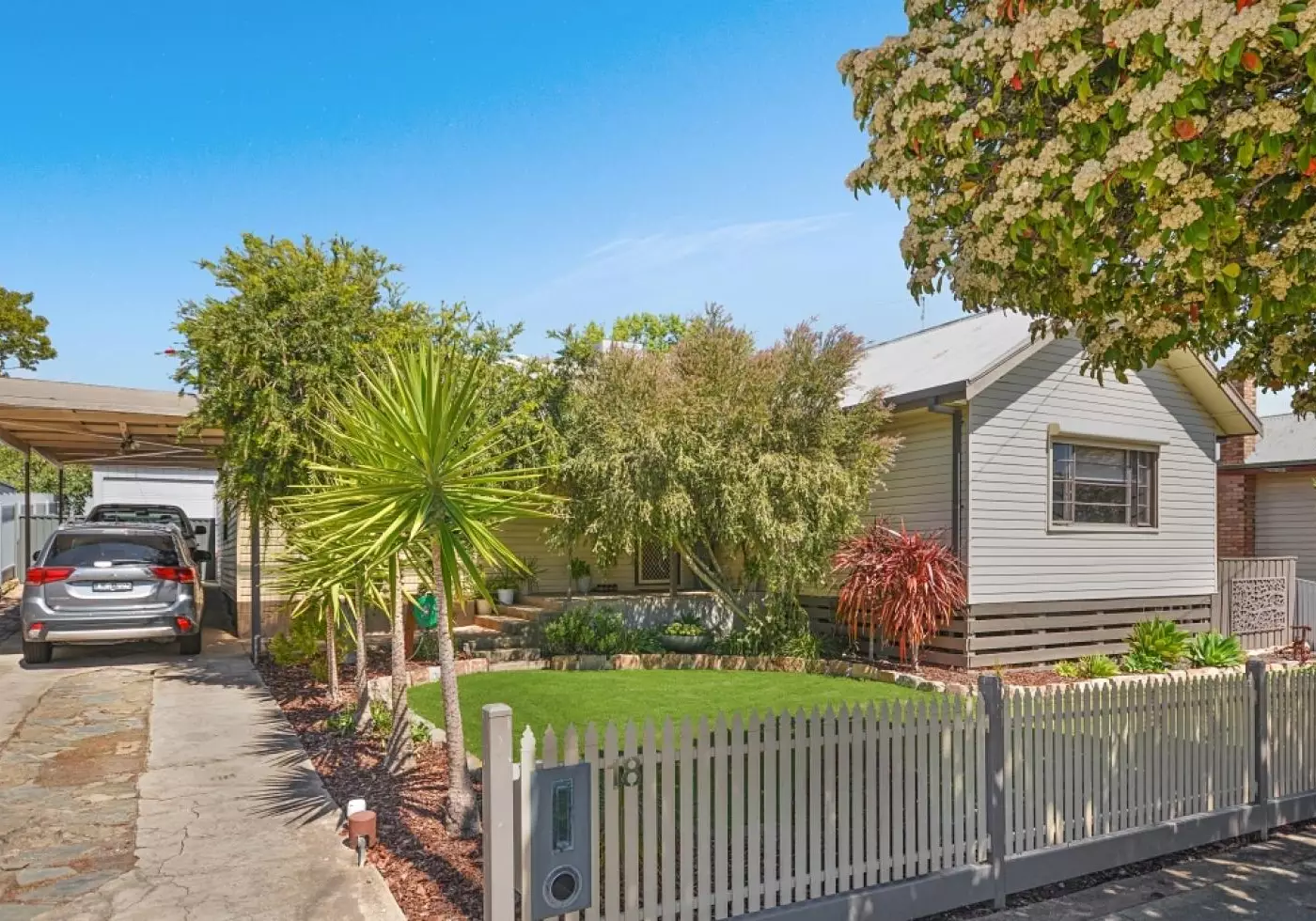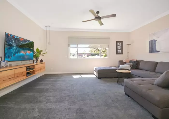 Extras include a double carport, rear covered deck, pergola, fire pit, six by six metre shed on slab with power, low maintenance exterior and lush established gardens.