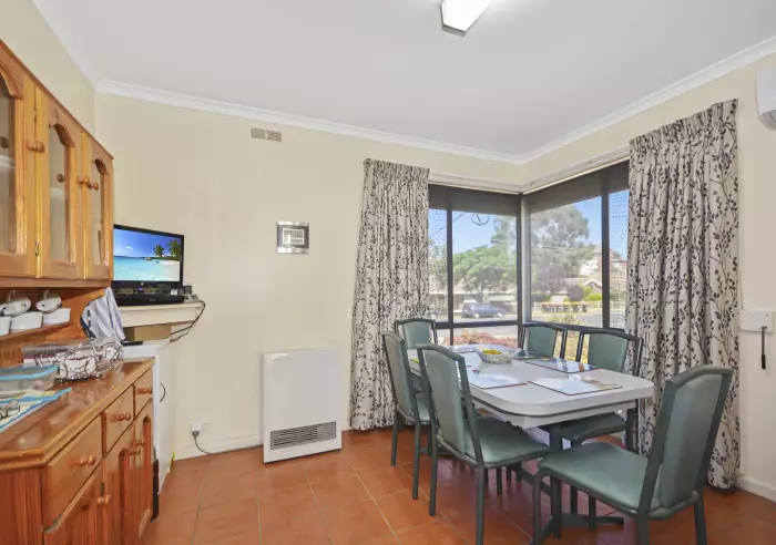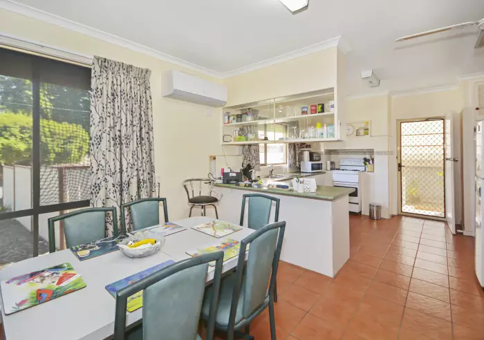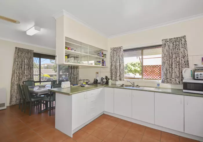 Plenty of natural light brightens the lounge with gas “open fire look” heating, the kitchen and meals area that enjoys gas heating, reverse cycle air-conditioning, electric cooking and a pretty park outlook. There are built-in robes in two of the three bedrooms, tiled bathroom with full bath, tastic and separate shower recess, separate toilet and storage in the laundry.