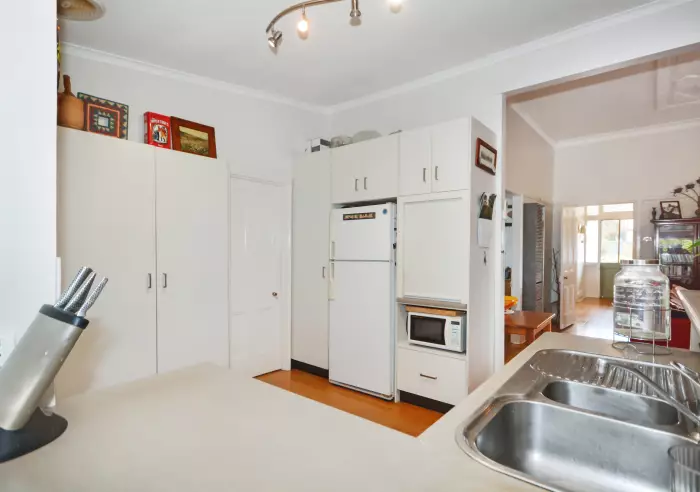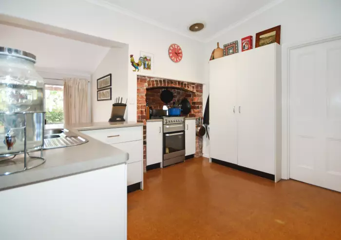 The focal points of the generous lounge room are the heart-warming open fire place, double French doors opening to the verandah, Baltic pine polished floor boards, the ornate plaster ceiling, reverse cycle split system air conditioning and gas heating. Adjoining the lounge are the kitchen with fan forced gas cooking, dishwasher and good cupboard space, plus the dining and sunroom area catch the morning sun and open out to the back porch.