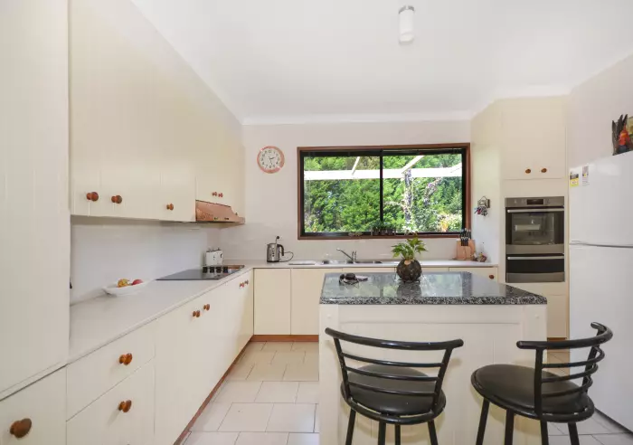 Possibly the best bit. Under roof and private at the rear of the home is a marvellous nine by five metre covered timber deck with cabinetry, sink, benches and overhead fans.