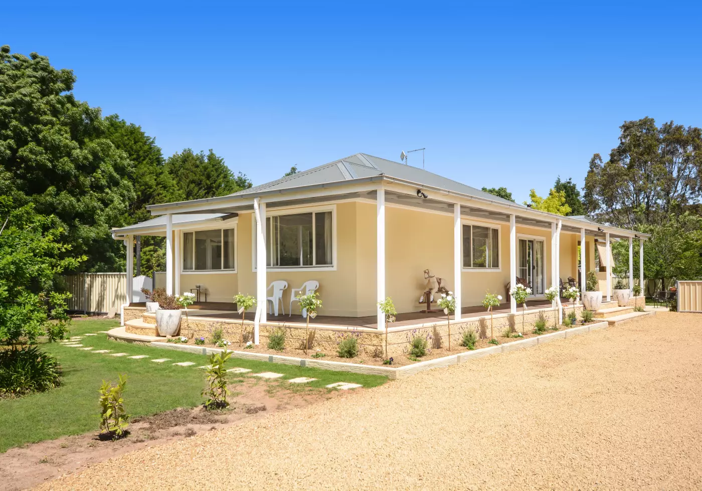 Verandahs on three sides, new colourbond roof, tree lined driveway, garden shed, carport, nine by five metre shed, dog and chicken yards, fruit trees, vegie garden, shade sail and studio.