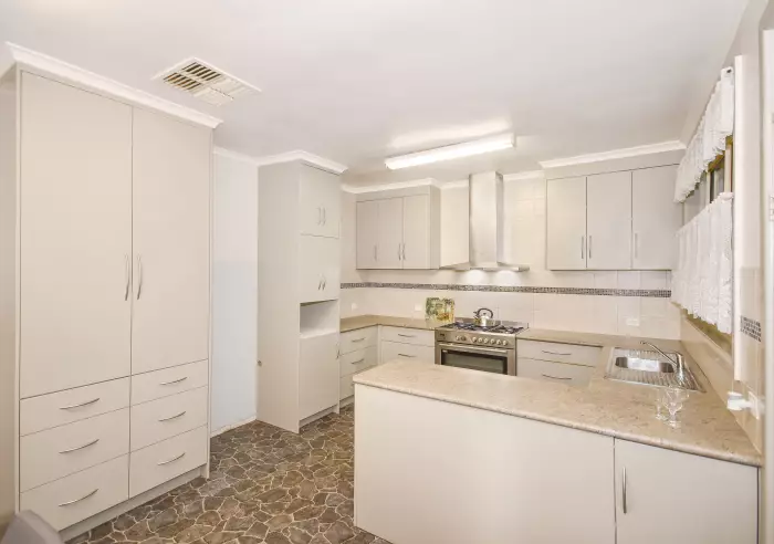 Unusual features include a cedar lined sauna off the bathroom with its massive spa bath, office or study, a silks room, three toilets and not one, but two walk-in robes to the huge main bedroom. The floor plan includes four bedrooms all with built-in-robes, ensuite to the main, separate gas heated lounge room, kitchen and dining area with cupboard space in abundance, dishwasher and 900mm Westinghouse freestanding gas stove with rangehood.