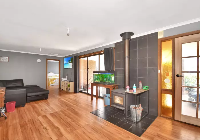 The living room and adjoining family dining area have floating floorboards throughout and are warmed with either gas or combustion heating, cooling is enjoyed via the full house evaporative cooler. Sliding doors open to a courtyard area. Kitchen includes gas cooking, rangehood and good cupboard space.