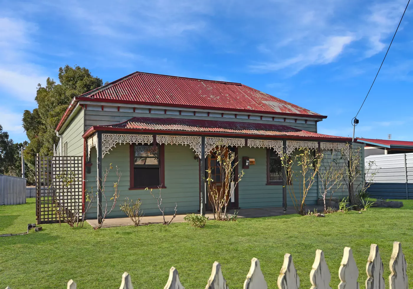 With the attractive cast iron lace fringed front verandah the floorplan includes an entry hall, lounge with gas heating, three double bedrooms, one with a pressed metal ceiling and the main unusually featuring an ensuite and a dressing or cot room, family bathroom with the shower over the full bath, two toilets, gas cooking in the kitchen and meals area.