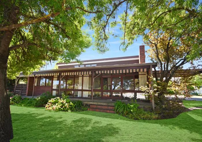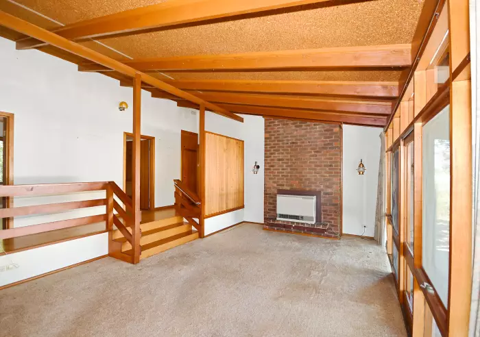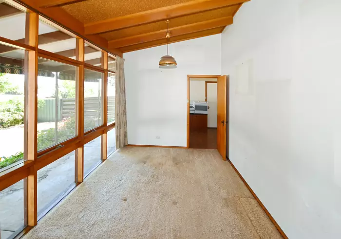 Upon entry you will be greeted by a central hallway which opens down to the living/dining area. Featuring gas heating and floor-to-ceiling windows running the length of the room, you'll enjoy a bright and inviting space. Exposed brick façade, raked ceilings, and the warmth of timber accents throughout are typical characteristics of builds at this time.