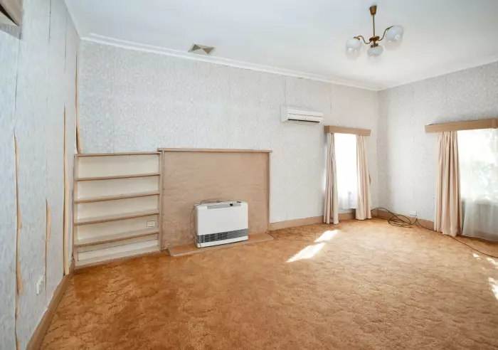 The layout includes a kitchen and meals area with a gas stove, lounge with a reverse cycle split system air conditioner and gas heating and three double bedrooms. .