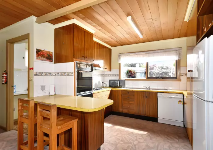 For a start it has three double bedrooms all with built-in robes, an eleven meter long sunken lounge room with a built-in bar and reverse cycle split system air conditioner that opens out to the walled garden, an all-electric, well equipped kitchen and dining area with dishwasher, good cupboard space and pantry.