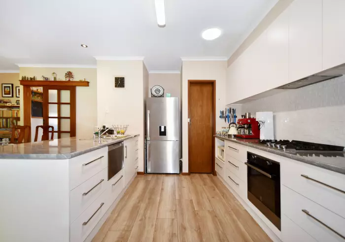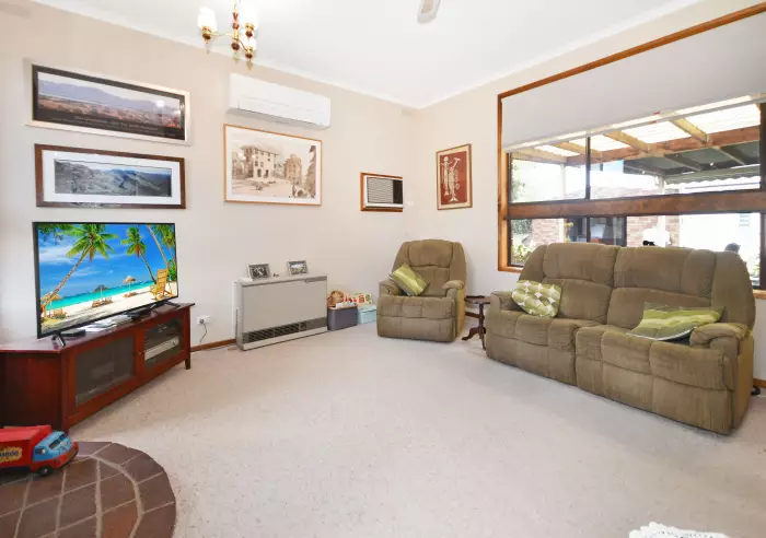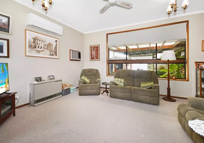 Three forms of heating are available in the generous lounge room, reverse cycle air conditioning, gas heating and an open fire place. Adjoining the lounge is the large well equipped kitchen and family dining area with gas and electric cooking, plenty of cupboard and bench space, dishwasher, pantry and opens directly to the large shady pergola perfect for outdoor entertaining.