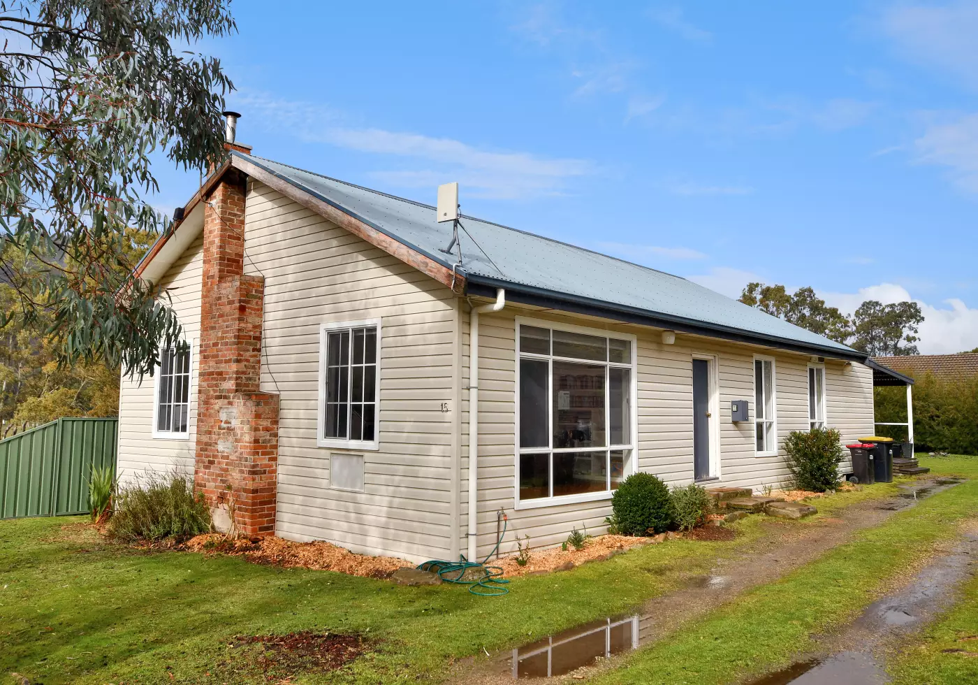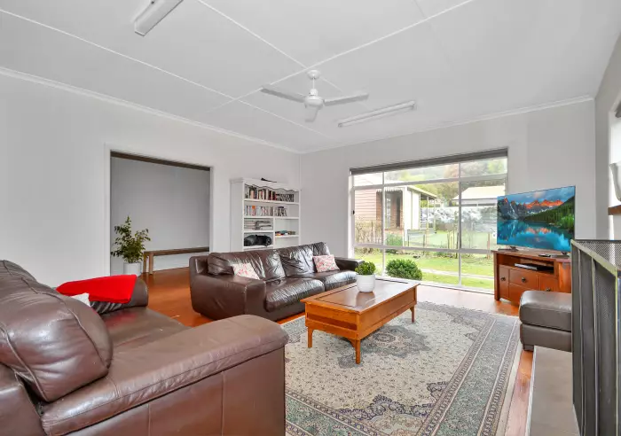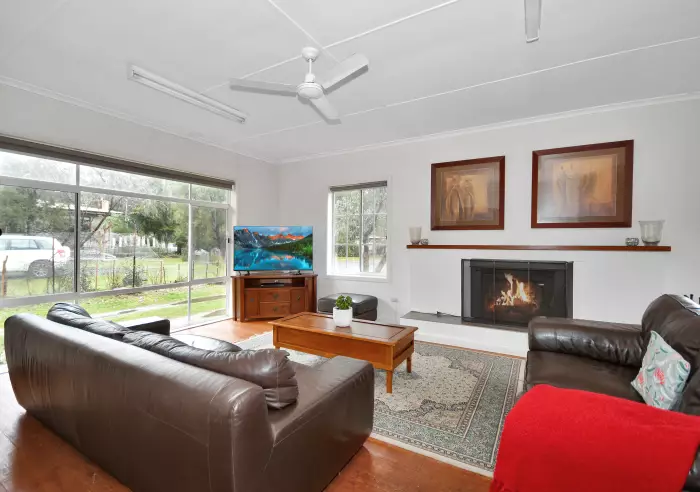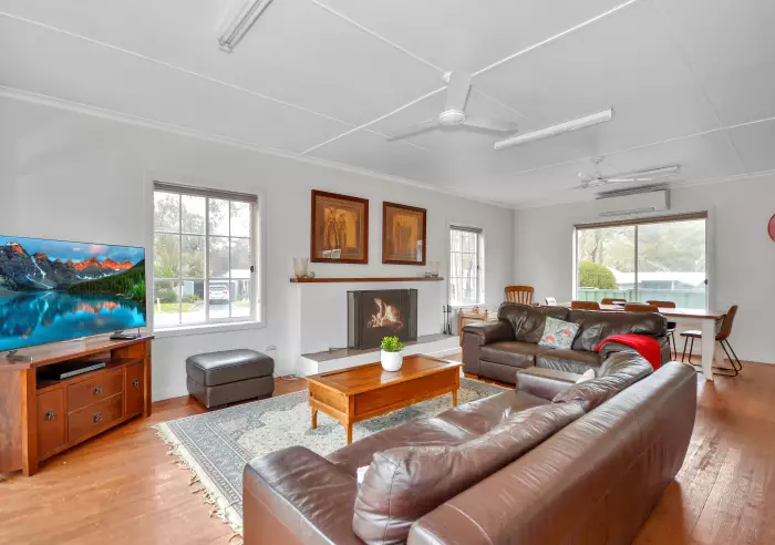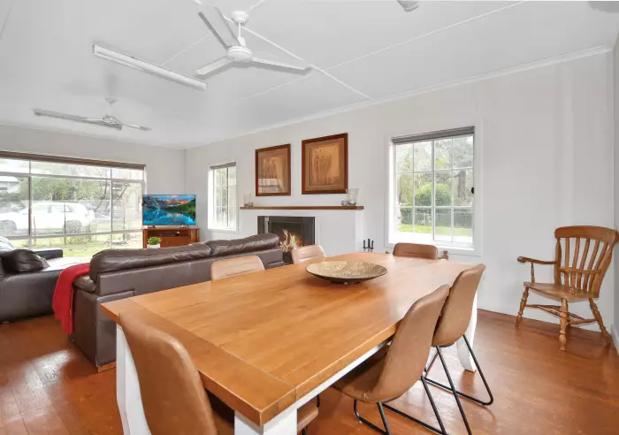 The wide entrance hall leads into the comfortable open lounge and dining room with big windows framing the views and a convenient combination of a reverse cycle split system and a chill busting combustion heater.  Adjoining the meals area is the kitchen with polished floor boards and terrific storage and bench space, dishwasher and electric cooking.