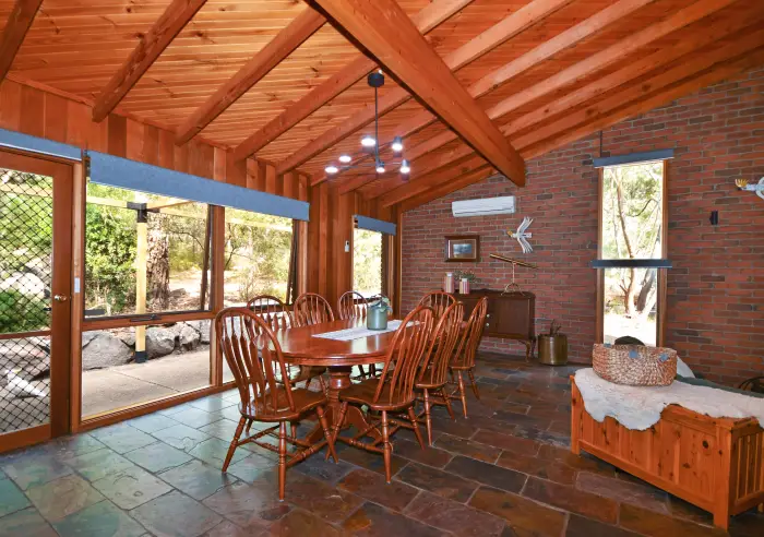 Flooded with natural light the carpeted lounge room and the slate floored family meals area both have soaring cathedral ceilings, a split system reverse cycle air conditioner and an economical home warming combustion heater for year round comfort. The adjoining kitchen is all electric with glowing timber cupboards and bench space, skylight and completed by the natural slate tiled floor.