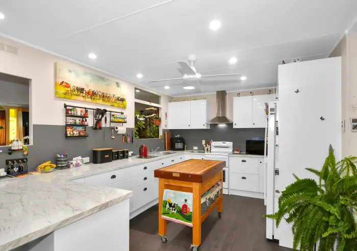 Living spaces include an air conditioned lounge room with a combustion heater, big family room with a reverse cycle air conditioner and another combustion heater, recreation room with its own bar and overhead fans, the recently remodelled kitchen and meals area with electric cooking, range hood, excellent cupboard and bench space.