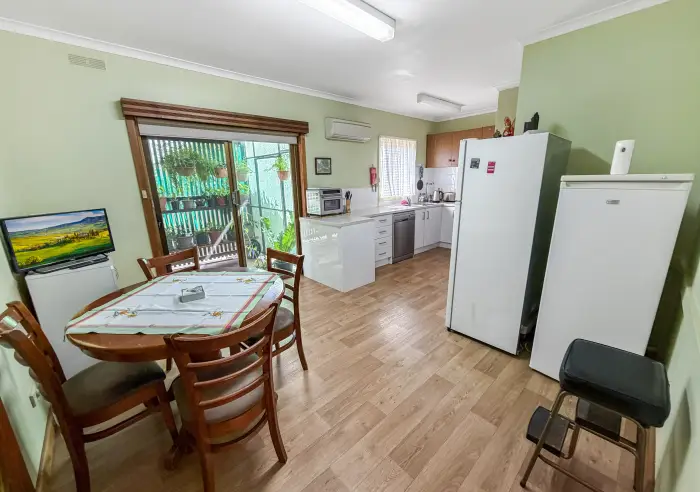 The kitchen has been recently renovated and is well-equipped with gas hotplates, an electric oven, dishwasher, and ample pantry storage. Adjoining is a comfortable meals area with its own reverse cycle split system, which opens out to an undercover rear verandah—an ideal spot to unwind or entertain guests.