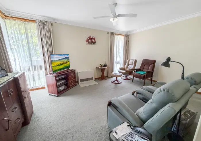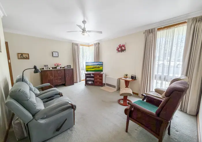 Inside, the main bedroom includes built-in robes, an overhead fan, and a reverse cycle split system for year-round comfort. The remaining two bedrooms are also fitted with built-in robes. The main living area is carpeted and kept warm with a gas heater, creating a cosy space to relax.