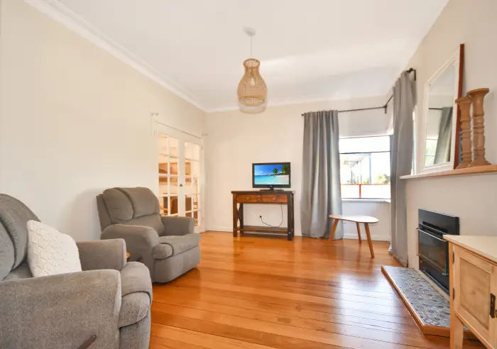 Double French doors lead through to a separate formal living room with gas wood-look heating, offering a second space to relax. From the kitchen, step outside to a quiet outdoor area—perfect for a morning cuppa or casual evening entertaining.