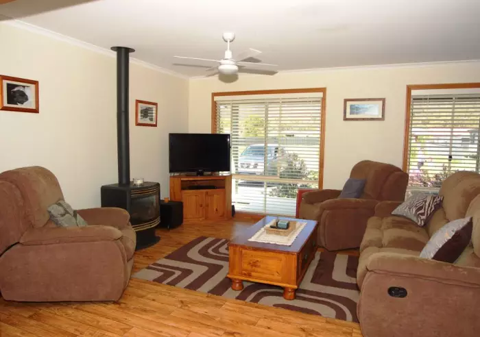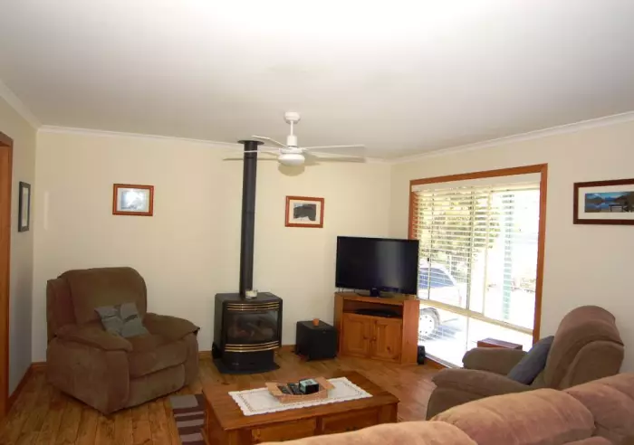 Comprising two very generous living areas namely the lounge with its wood fire look gas heater opening to the front verandah and the family room with reverse cycle split system air conditioning accessing the rear deck there is plenty of room for comfortable relaxing all year round. The well equipped kitchen naturally boasts a dish washer, electric cooking, plenty of cupboards and a breakfast bar, the oversize bathroom has a separate shower, full bath, vanity and tastic, separate toilet and built-in robes feature in both the double bedrooms.